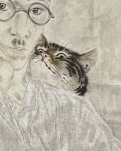 さらにこの作品には鑑賞者に向けられた視線がもう一つある。画面右下、藤田の背後に寝そべるキジトラネコのそれだ。見下ろすような角度でこちらを見るその顔はいわゆる「ドヤ顔」といっても差し支えないだろう。静かな自信をたたえた作家の視線とは異なり、あからさまに得意げで挑発的である。