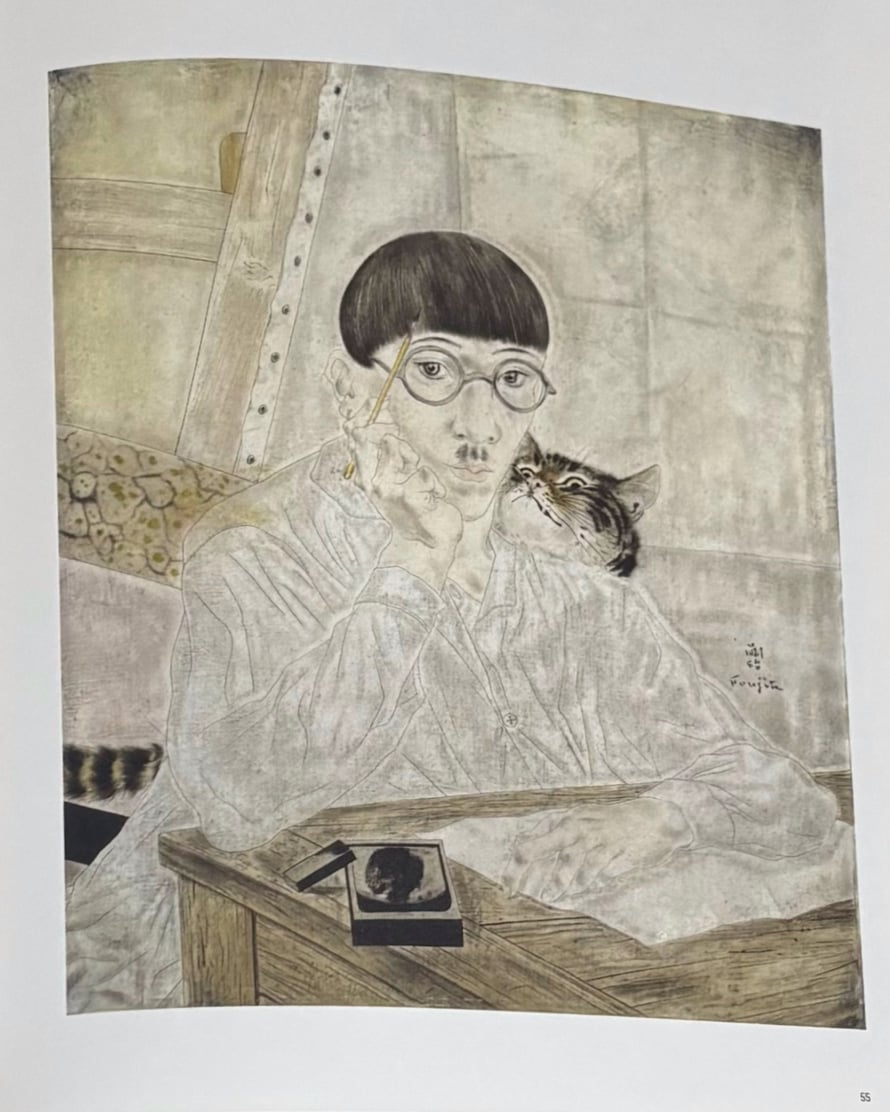 ネコの表情の比較として同カタログ掲載の1936年の《自画像》もみてみよう(図10)。1936年、藤田は東京にいた。くわえタバコをして足をひろげ、後ろによりかかる格好で座っている藤田のはだけた着物の隙にネコがいる。この作品にフランス帰りであることをアピールするような洒落たものは見当たらない。描かれているネコはどこを見つめているのだろう。晩年、フランス国籍を取得し日本を離れることになる藤田だが、この時はいったい何を思っていたのだろうか。想像をかきたてられる。